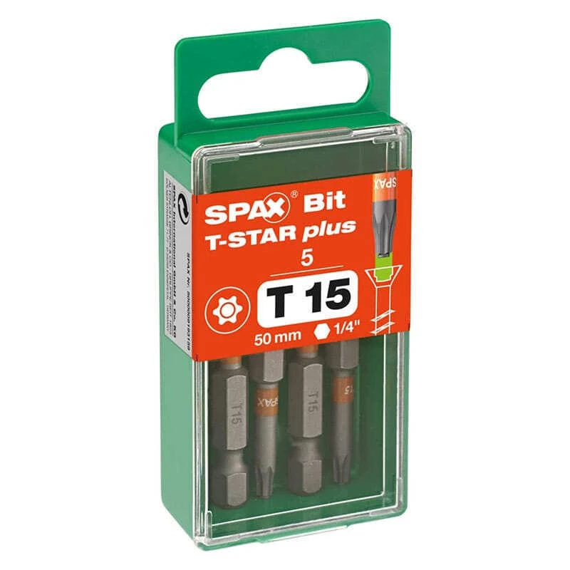 En complément de notre gamme SPAX avec prise de force T-STAR plus, nous proposons des embouts SPAX en version T-STAR plus exactement assortis à nos vis et facilement identifiables grâce au codage couleur orange. Ces embouts sont disponibles dans les tailles de lame T10 à T50. Les embouts SPAX T-STAR plus vous permettent d’obtenir une meilleure transmission de la force grâce à un ajustage parfait, une durée de vie plus longue et une insertion plus rapide.