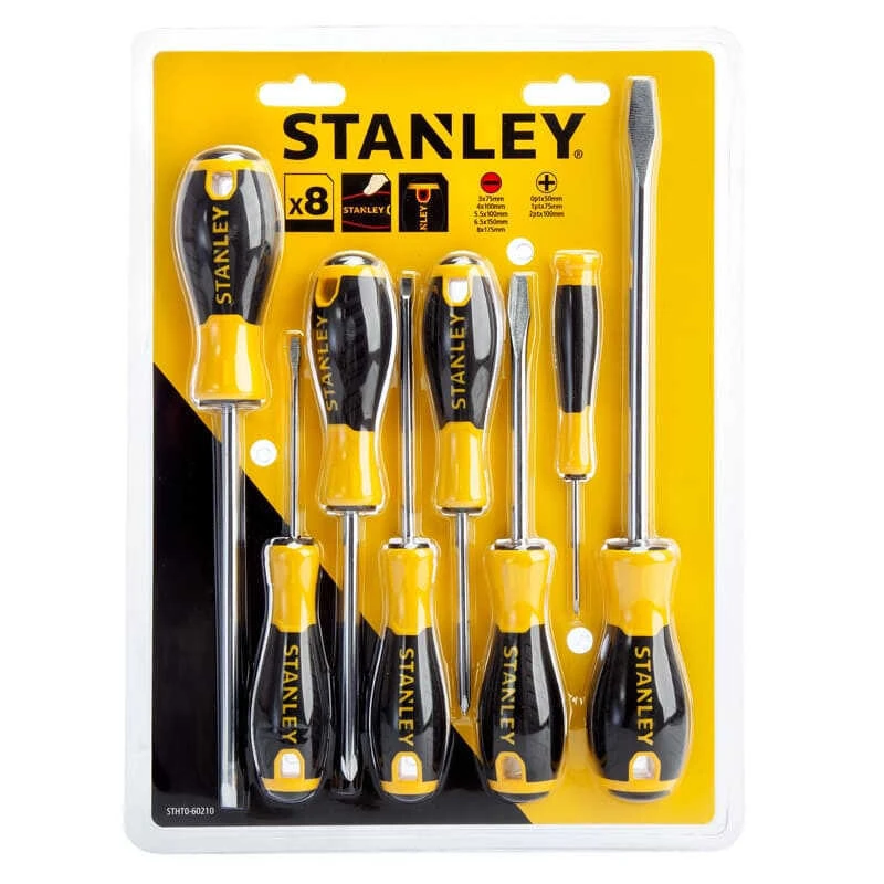 Procurez vous le lot de 8 tournevis PH/SL de la marque STANLEY. Ils sont solides et performant. Cette offre contient 8 pièces : Tournevis PH0 (poche 50mm), PH1 (petit 75mm), PH2 (moyen 100mm), Standard (évasé) 3mm (petit 75mm), 5.5 mm (moyen 100mm), 6.5mm (grand 150mm), Cabinet (parallèle) 4mm (petit 100mm), 6.5mm (grand 150mm).