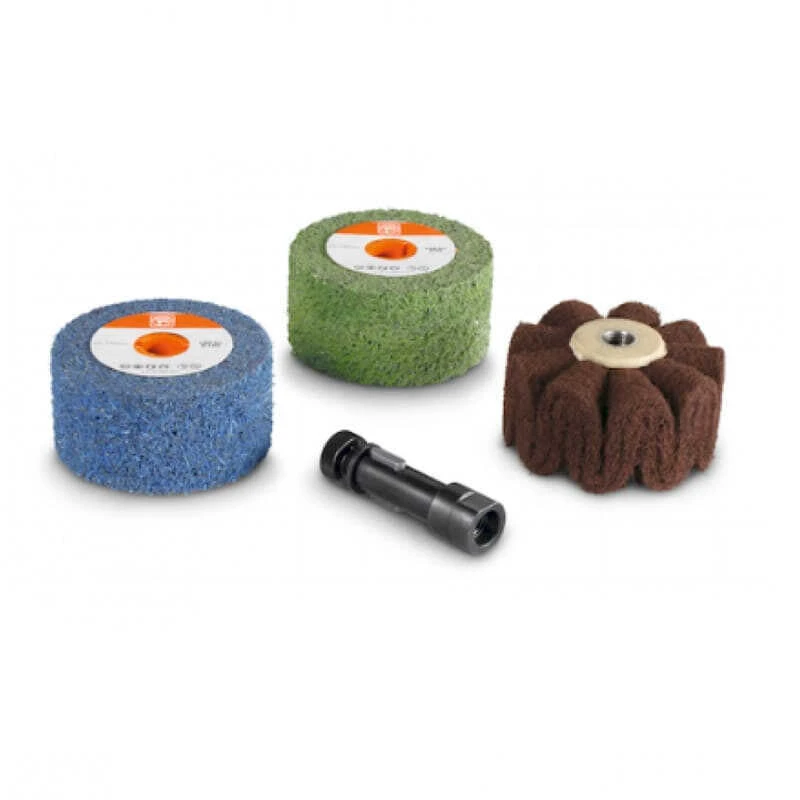 Polissage satiné de profilés pour un aspect impeccable. Comprend : 1 roue à poncer élastique grain 60 moyen (6 37 21 054 01 0), 1 roue à poncer élastique grain 180 fin (6 37 21 055 01 0), 1 roue fibre Sinus grain fin (6 37 21 056 01 0), 1 axe de fixation (6 38 03 071 02 0).